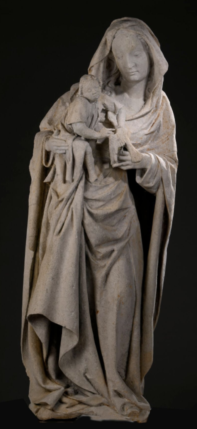 Cette magnifique statue en pierre représentant une Vierge à l’Enfant jouant avec un oiseau s’inscrit dans la tradition mariale de la fin du la période gothique pendant laquelle l’interaction entre l’Enfant et sa mère devient à la fois plus expressive et plus sensible. Les détails vestimentaires, à savoir l’ample manteau recouvrant la tête et le corps de la Vierge animé de plis profondément creusés et s’évasant en partie inférieure ainsi que la tunique de l’Enfant sont caractéristiques de l’École bourguignonne du XVe siècle. Combinée avec le canon au front bombé de la Vierge et avec l’attitude dynamique de l’Enfant, notre œuvre se rapproche de la production des Vierges à l’Enfant de la sphère burgondo-flamande de la fin du XVe siècle.