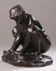 Aristide Maillol (1861-1944), La Femme au crabe, première version, modèle créé vers 1905, fonte vers 1906-1909, probablement réalisée à la demande d’Ambroise Vollard, bronze à patine brun nuancé de rouge, monogramme de l’artiste « M » sur la terrasse à l’avant du pied gauche, h. 16,5 cm. Estimation : 15 000/20 000 €