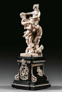 Place aux ivoires le vendredi 3 octobre, à Drouot (Giquello OVV. Cabinet LacroixJeannest). Il fallait prévoir 26 000 € pour cet Enlèvement de Proserpine (h. totale 41 cm), sculpté au XIXe siècle en Autriche ou en Allemagne d’après Lorenzo Mattielli (1687- 1748), et 22 100 € pour la Vénus pudique et l’Antinoüs du Belvédère (h. 41 et 42 cm, voir Gazette n° 33, page 49), exécutés d’après l’antique en Allemagne ou en Italie, probablement dans la seconde moitié du XVIIIe siècle. 7 800 € étaient déboursés pour Judith et Holopherne (95 x 70 cm, M. Martenet, expert – Voir Gazette n° 33, page 47), peints à Florence dans l’entourage de Ghirlandaio (1503-1577). La Vierge apparaît à saint Luc peignant la Pietà, une huile sur toile (220 x 143 cm) exécutée par Giuseppe Bartolomeo Chiari (1654-1727) vers 1685, reproduite page 46 de la même Gazette, ne trouvait pas preneur.