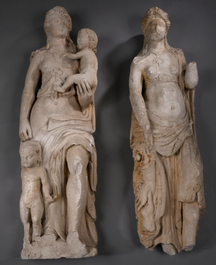 Rondes bosses en argile chamoisé et pierre calcaire avec traces de polychromie
