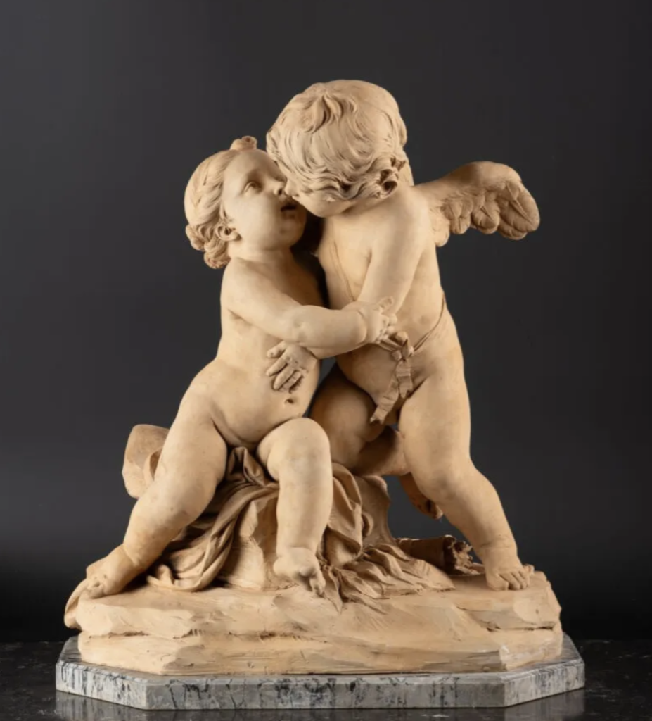 En raison de la présence d’une signature et d’une date apocryphes, le groupe en marbre Amour et Psyché, conservé à la Wallace Collection a longtemps été attribué au sculpteur français Claude-Augustin Cayot (1677-1722). Les récentes recherches ont permis d’identifier l’artiste à l’origine de ce groupe, Filippo della Valle (1698-1768). Bien qu’ayant réalisé sa carrière à Rome, le sculpteur florentin se rapproche des sculpteurs français comme Michel-Ange Slodtz et reçoit l’influence du baroque hérité de François Duquesnoy. Cette influence se traduit notamment à travers le morphotype des enfants et la terrasse naturaliste L’original marbre semble avoir été prêté par sa propriétaire la Marquise de Hertford pour l’exposition d’art décoratif, intitulé Musée Rétrospectif au Palis de l’Industrie en 1865, et un article de 1986 indique que c’est probablement à cette période que la signature apocryphe ‘Cayot’ a été apposée au marbre. L’article mentionne l’apparition de plusieurs versions en terres cuites dérivant du groupe en marbre au milieu du XIXème siècle . Ces copies présentent, contrairement à l’original, un cache-sexe sous la forme du ruban tombant judicieusement sur le devant.