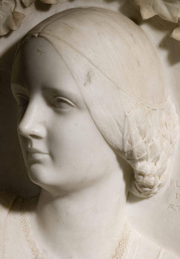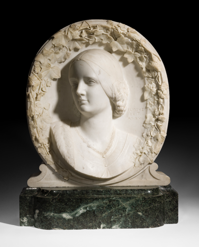 Grand connaisseur de l’art antique et de la Renaissance italienne Triqueti adapte pour ce portrait à la fois intime et savant le type du « buste-médaillon ». S’inspirant des « imago clipeata » (image-bouclier) de l’Antiquité gréco-romaine et du « tondo » de la Renaissance florentine, le sculpteur inscrit le portrait de sa fille en très haut-relief dans un cadre circulaire au fond concave largement creusé. Il reprend à son compte une typologie de portrait réservé à l’aristocratie sous l’antiquité qu’il a aussi admirée sur la porte du Paradis de Lorenzo Ghiberti (1378-1455) à Florence, pour en faire une œuvre romantique, singulière et moderne. Le pourtour de ce grand disque de marbre blanc est décoré de lierre, symbole de la longévité et de l’amour constant. Le musée Girodet conserve un beau plâtre préparatoire sur lequel la plante grimpante est modelée avec grand soin. Ce décor végétal, le costume et les cheveux de la jeune fille retenus en un lâche et souple chignon dans une résille lacée sur le haut du front, renvoient encore aux portraits féminins de la Renaissance (vers 1852, œuvre préparatoire en plâtre, fer et bois, H. 59,1 cm, Montargis, musée Girodet, n°inv. 989.139). Ces éléments s’approchent aussi du courant préraphaélite que Triqueti n’a pu ignorer si l’on songe à ses nombreuses fréquentations anglaises et aux importants projets britanniques qui s’annoncent. L’imposant et coûteux bloc de marbre ainsi que les flatteuses références à l’antiquité et aux grands maîtres de la Renaissance laissent imaginer les grandes espérances et l’amour inconditionnel d’un père pour sa toute jeune fille de quinze ans.