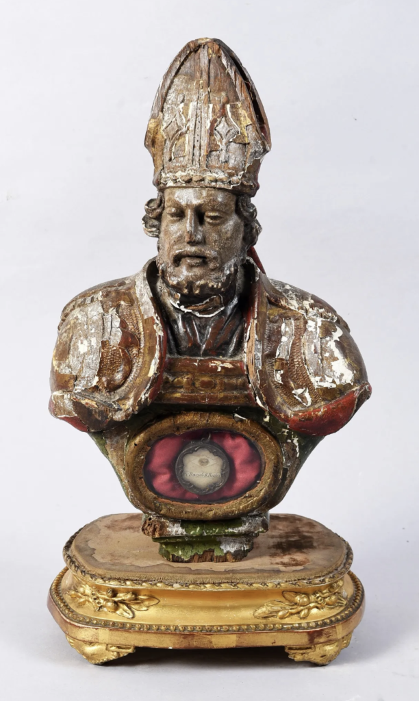 Bois sculpté polychromé et doré, le torse accueillant une vitrine ovale