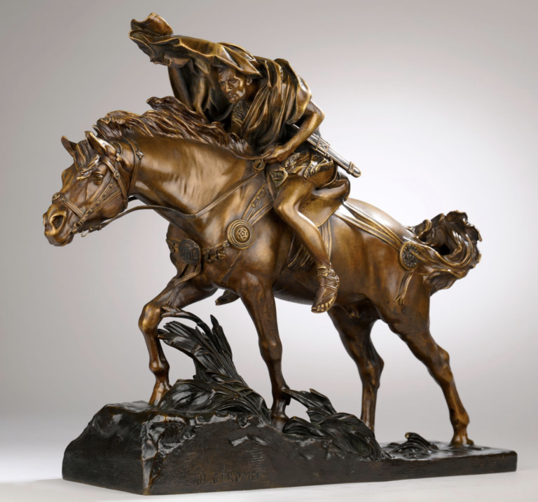 Le célèbre peintre Jean-Léon Gérôme s’essaye avec succès à la sculpture à l’occasion de l’Exposition Universelle de 1878. Il exécute alors des statuettes, le plus souvent peintes, en s’inspirant de ses propres peintures. Influencé par l’Antiquité grecque, romaine ou égyptienne, par l’Orient ou encore par l’histoire contemporaine, Gérôme crée de savantes sculptures avec un goût pour le détail, les matières et la couleur qui font de ses créations aux accents symbolistes ou « néo-pompéien » un corpus d’œuvres à part dans le paysage de la sculpture française de la fin du XIXe siècle. Réalisé vers 1900, cette statuette équestre figure Jules César de retour à Rome sur les du Rubicon après avoir vaincu les Gaulois en 49 av. J.-C. Le modèle connait un large succès et l’édition en bronze est confiée au fondeur Siot-Decauville.