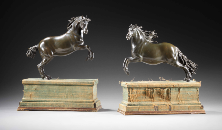 C’est à l’occasion de la grande exposition de 1979 dédiée à Giambologna tenue successivement au Royal Scottish Museum, au Victoria & Albert Museum et au Kunsthistorisches Museum que les modèles de ces deux chevaux fougueux ont pour la première fois été identifiés comme de la main de Ferdinando Tacca (1619-1686). L’article rédigé par Katherine Watson convainquit le monde de l’art de la paternité de ces œuvres au fils de Pietro Tacca successeur en 1640 de son père comme sculpteur et architecte de la cour des Grands Ducs de Médicis à Florence. Tout en héritant de l’atelier fondé par Giambologna puis dirigé par Pietro Tacca, Ferdinando Tacca a fait carrière comme concepteur de grands projets architecturaux et d’œuvres éphémères pour des évènements festifs et cérémoniels. Bien qu’il ait perpétué certains des modèles célèbres créés par Giambologna puis diffusés par son père, Ferdinando Tacca a aussi créé des œuvres originales au style plus personnel inspiré du courant baroque. A la suite des recherches d’Anthony Radcliffe et Charles Avery, Katherine Watson donna l’attribution de ces modèles à Ferdinando Tacca en démontrant que son style était à la fois plus exubérant et plus fluide que celui de Giambologna et Pietro Tacca à qui ces chevaux étaient précédemment attribués. Les deux chevaux cabrés mis en paire appartiennent à un rare corpus ne comprenant qu’une quinzaine d’exemplaires répertoriés de nos jours, la plus raffinée se trouvant au Museo Nazionale del Palazzo di Venezia à Rome. Avec une grande virtuosité et une admirable inventivité, les deux chevaux offrent à voir des allures de dressage complexes. L’un des chevaux se cabre sur ses pattes arrière, les pattes avant repliées dans une attitude dite « en corvette ». L’autre animal réalise la passe dite « en pesade » : le cheval bondit en avant, les pattes arrière tendues tandis que ses pattes antérieures descendent. Le dynamisme général de la composition est accentué par la vivacité des crinières finement ciselées, le détail des ferrures des sabots et de la bouche, enfin par le fin brossage du métal souligné par une patine brune nuancée de vert. Il est à noter que notre exemplaire du cheval en pesade est la seule version avec les exemplaires du Seattle Art Museum et du Bargello dont la queue est relevée et attachée par un nœud, à l’instar de l’exemplaire du Palazzo di Venezia de Rome.