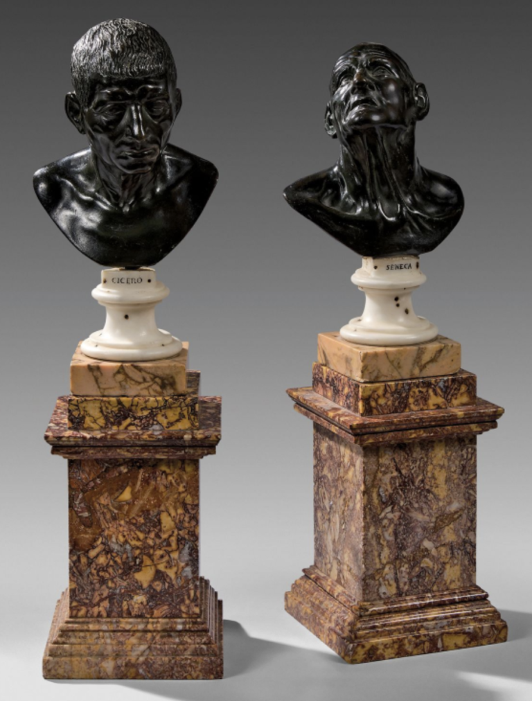 H. totale Cicéron : 27 cm ; H. totale Sénèque : 24,7 cm ; Sur des piédouches en marbre et des contre-socles en marbre beigne, posées sur des bases cubique en marbre ; H : 20,6 cm