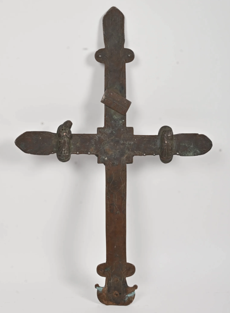 Croix en alliage cuivreux décorée sur une face de motifs végétaux, d'un médaillon central figurant le Christ assis bénissant entouré de médaillons quadrilobés représentant le tétramorphe avec traces de dorure, émail bleu ( ?) ; et de l'autre face, d'une crucifixion gravée entourée de deux poupées d'applique représentant la Vierge et saint Jean