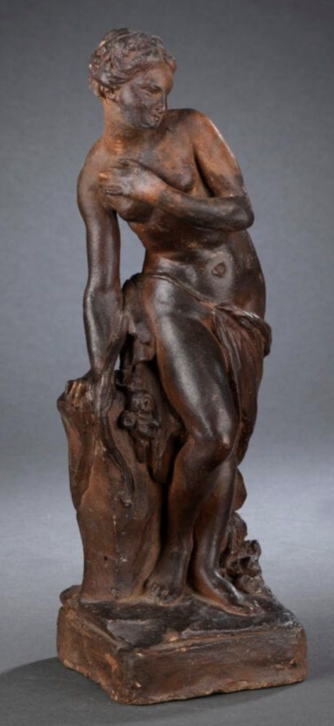 Bien qu’aucune sculpture de Diane réalisée par Jacques-François Saly nous soit parvenue, les éléments stylistiques de cette terre cuite nous laisse entrevoir la main de ce sculpteur originaire de Valenciennes. La physionomie de cette figure avec son nez fin, sa petite bouche, son menton etroit, sa coiffure raffinée et ses yeux étirés la rapproche des œuvres que nous connaissons de cet artiste. Également, la déclinaison d’éléments décoratifs rocailles, et notamment les petites fleurs en bouton, est caractéristique de la manière de Saly.
