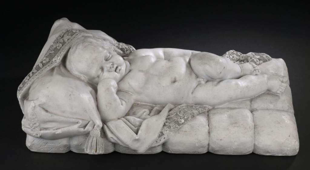 L’iconographie de cette œuvre tire son inspiration de deux modèles d’enfants endormis créées par le célèbre sculpteur flamand François Duquesnoy et l’un de ses suiveurs, Artus Quellinus I. On y retrouve le même traitement des chairs – ces joues pleines et ce front bombé typiques de Duquesnoy – ainsi que le matelas emprunté à Quellinus I. Notre artiste J. Poupaert, actif dans la seconde moitié du XIXème siècle et dont on connait peu de choses, personnalise le sujet en enrichissant le drapé d’une fine broderie de feuilles de lierre.