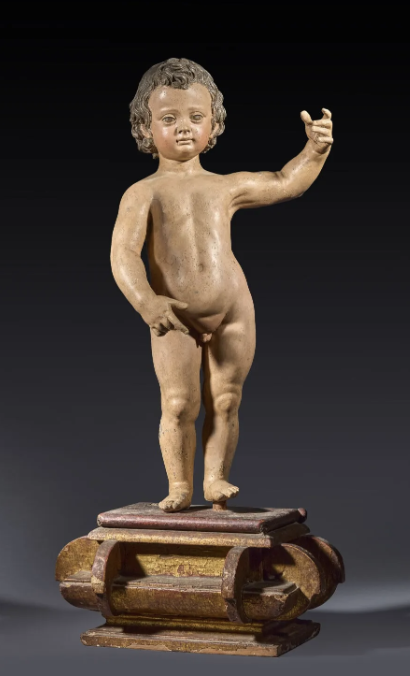 Notre œuvre appartient à un important corpus d’enfants Jésus triomphants, représentés vers l’âge de 4 ou 5ans, habillés ou nus, tantôt dans une attitude de bénédiction ou tenant un objet dans leur main.
