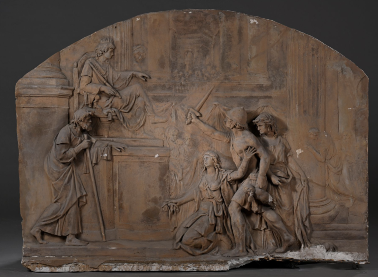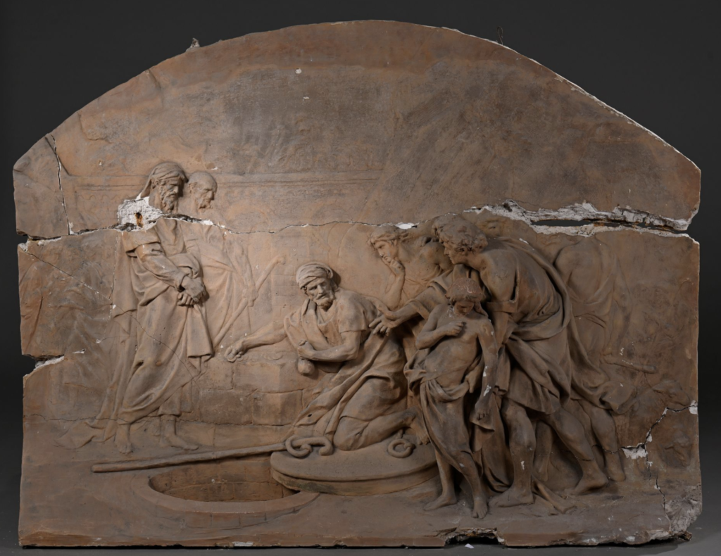Cet ensemble de quatre reliefs en plâtre patiné présente des sujets iconographiques complexes et érudits issus de l’Ancien Testament : Un Mort ressuscité par l’attouchement des os du prophète Élisée, le Jugement de Salomon, Abimélech rend Sara à Abraham avec des présents, Joseph vendu par ses frères. La connaissance de l’original de ce dernier sujet conservé au musée du Louvre permet d’émettre une hypothèse solide au sujet du contexte de réalisation de ces copies en plâtre. Il correspond au sujet du Grand Prix de sculpture de l’année 1784 emporté par Antoine Denis Chaudet. Compte tenu de similitude des compositions et de l’homogénéité des sujets, il est possible que les trois autres moulages aient été tirés d’œuvres présentées par des artistes pour d’autres concours du Prix de Rome, lauréats ou non. La liste des sujets des concours nous apprend que le Mort ressuscité par l’attouchement des os du prophète Élisée a été proposé en 1783 et remporté par Auguste Félix Fortin mais l’œuvre originale est aujourd’hui inconnue. Le Jugement de Salomon correspond au thème du concours de 1790. L’œuvre lauréate a été réalisée par François Frédéric Lemot et est conservée à l’École des Beaux-Arts, mais le modèle ne correspond pas à notre iconographie. Enfin le thème Abimélech rend Sara à Abraham avec des présents est l’objet du concours de 1791 et remporté par Pierre Charles Bridan. Cette œuvre originale non plus n’est pas connue.
