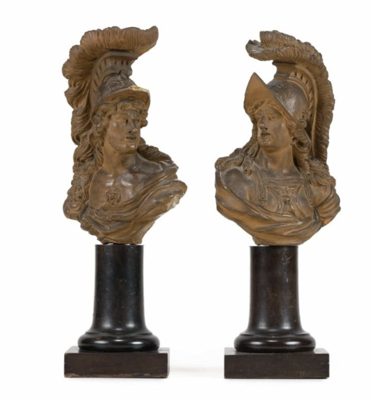 Ces bustes en terre cuite ont été réalisés par Jacob-Sigisbert Adam, le fondateur de la célèbre dynastie de sculpteurs lorrains ayant oeuvré sous les règnes de Louis XIV et Louis XV, et par son atelier. La rétrospective historique tenue au musée des Beaux-Arts de Nancy en 2021 a non seulement contribué à réunir un grand ensemble des chefs d’oeuvres exécutés par cette dynastie, mais a aussi permis de réactualiser la recherche grâce aux contributions de nombreux spécialistes. Le catalogue de l’exposition a ainsi mis en relation ces deux soldats grecs coiffés de casques aux impressionnants panaches au buste représentant Achille conservé au musée Charles-Friry de Remiremont. Les deux célèbres héros de la guerre de Troie se font ici face, Hector barbu et Achille imberbe et le regard courroucé. Ce dernier porte, à l’instar de la version de Remiremont, une cuirasse composée de trois bandes cloutées et un masque central grimaçant sur le plexus. Le héros porte également un drapé, absent de la version de Remiremont. Le buste d’Achille peut, quant à lui, se rapprocher d’une oeuvre identifiée comme Alexandre le Grand et illustrée p.32 du catalogue (fig. 13) : l’armure du conquérant est ornée de la même tête de lion enveloppant l’épaule droite et recouverte du même drapé transverse. Notre buste de Hector se distingue cependant par la présence d’une tête de Gorgone sur le thorax et non de la cuirasse à trois bandes cloutées. Ces variantes, comme l’indique M. Pierre-Hippolyte Penet, sont les témoins d’un travail d’atelier issu d’un même modèle exécuté par Jacob-Sigisbert Adam et de l’engouement des collectionneurs pour ces représentations de héros classiques.