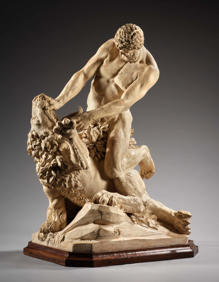 Signée et datée “Bardi Fecit 1790”, cette impressionnante terre cuite représentant Hercule et le lion Némée, a été réalisée par Andrea Bardi d’après un modèle créé par Ignazio Collino (1724-1793), dont on connaît une version en terre-cuite (Turin, Académie Albertina, inv. 376) et une autre en marbre (Château de Ferrières-en-Brie).