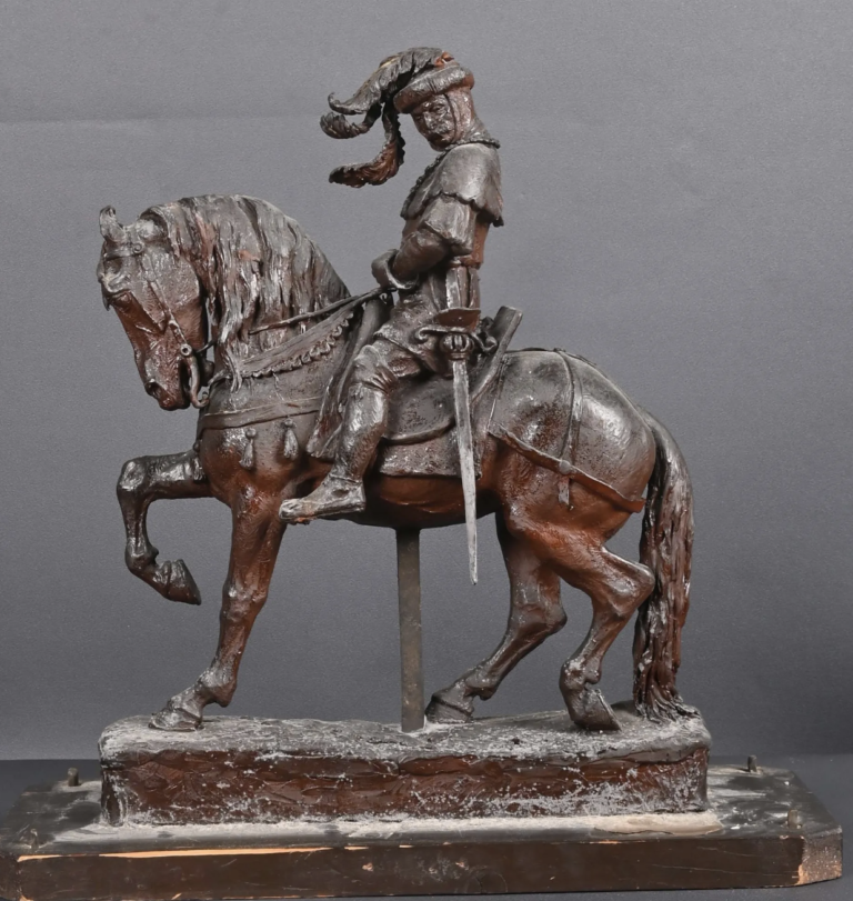 Probablement la statuette équestre “Homme d’armes en vedette” présentée au Salon de 1877 sous le numéro 3924.