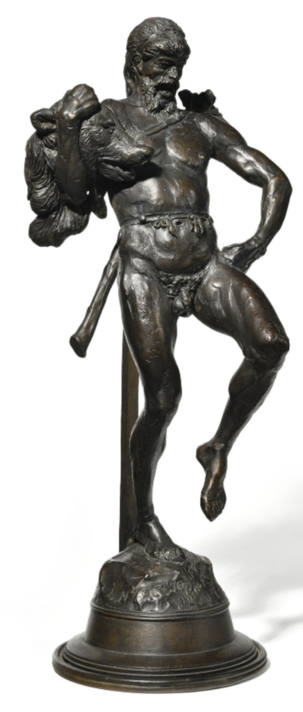 -Emmanuel Frémiet, Homme de l’âge de pierre, 1875, bronze, signé « E. FREMIET » sur la base, titré sur l’épaisseur de la base « AGE DE LA PIERRE », porte le cachet du fondeur « THIEBAUT FILS », dim. : 225 x 110 x 90 cm, Paris, Musée d’Histoire naturelle, inv. FNAC PFH-8682.