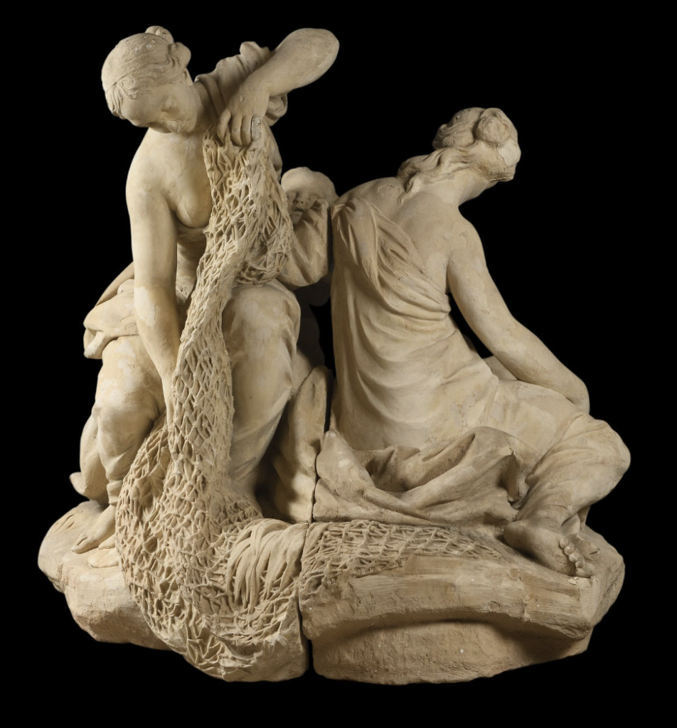 Ces deux spectaculaires groupes en pierre destinés initialement à l’ornement d’un parc ont été exécutés par le célèbre sculpteur Étienne-Maurice Falconet (1716-1791). Dans un style alliant les derniers soubresauts du Rococo et les frémissements d’un néoclassicisme assagi, ces allégories de la Chasse et de la Pêche ont été achevées, comme l’indique la date inscrite sur l’un des deux, en 1780, peu après le retour de l’artiste de son séjour de douze ans en Russie. Les sculptures ont été réalisées à une échelle monumentale d’après des modèles pensés pour la manufacture de Sèvres une vingtaine d’années plus tôt, en 1758. Ces deux sculptures n’étaient pas répertoriées dans l’ouvrage de référence de l’artiste, publié en 1922 par le spécialiste Louis Réau (1881-1961). Un tapuscrit non daté, titré « Deux chefs-d’œuvre de Falconet : la chasse et la pêche » rédigé postérieurement par cet historien de l’art et précieusement conservé à la documentation du musée du Louvre, confirme officiellement la paternité de ces œuvres monumentales à l’artiste.