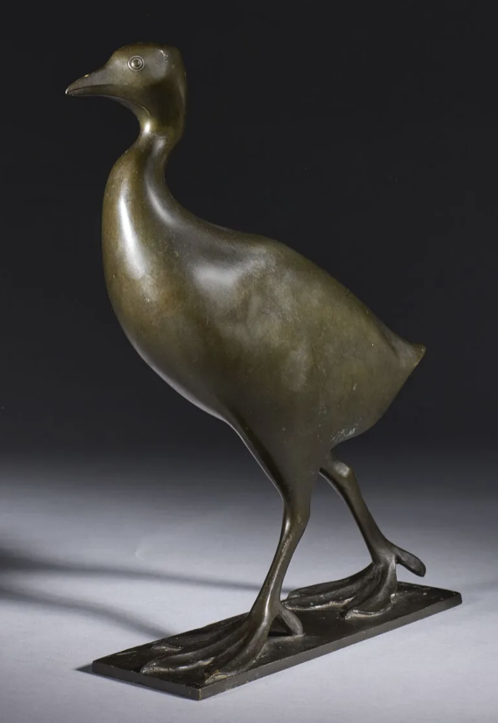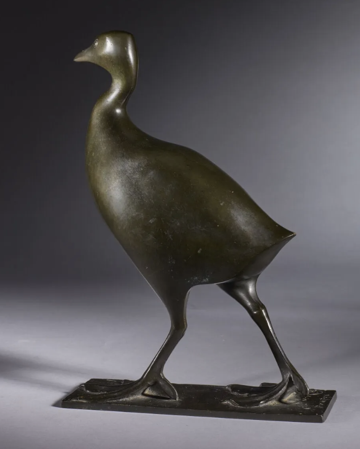 – François Pompon, Poule d’eau ou Foulque, bronze, fonte vers 1925-1930, signé sur la terrasse à l’arrière du petit côté “Pompon” et porte le cachet du fondeur ” cire perdue C. Valsuani “, sans numérotation, H. 28,0 ; L. 6,6 ; P. 19,5 cm , Paris, Musée d’Orsay, n° inv. RF 4051 ;