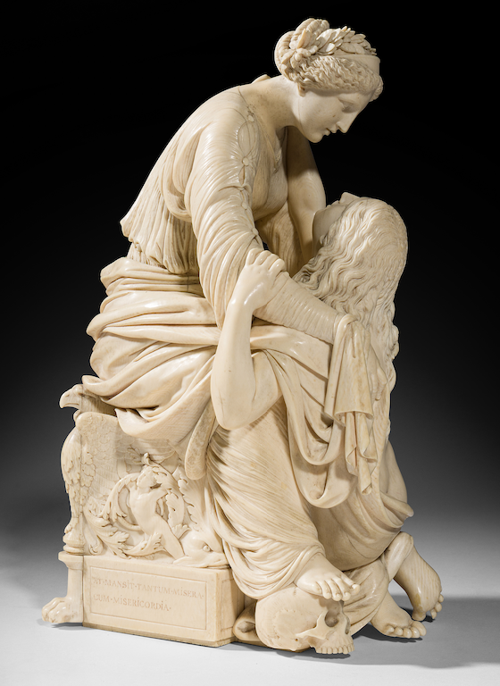 L’artiste se distingue toutefois de cette production en faisant preuve d’une innovation visuelle spectaculaire : le groupe présente deux séquences narratives parallèles sur chacun des côtés. Sur le côté gauche, on observe Marie-Madeleine le flanc complètement dénudé. Image symbolique d’Eve « la fautive », elle implore à genoux l’absolution de ses péchés auprès de la femme impérieuse qu’elle agrippe, pleine d’espoir. Cette dernière a déjà tendrement glissé sa main gauche dans la chevelure sensuelle de la repentante. La connexion visuelle entre les deux femmes est d’une intensité hors norme, passionnée. Dans le regard de Marie-Madeleine se lit la supplication, dans celui de la Miséricorde, l’amour et le pardon. Le côté droit de l’œuvre affiche le moment si émouvant du pardon. La Miséricorde enlace d’un geste maternel et semble protéger Marie-Madeleine dans son giron, tout en couvrant pudiquement sa nudité de son manteau aux nombreux plis. De son pied droit elle écrase en signe de victoire le crâne de Vanité, attribut traditionnel de la sainte, symbole de la fragilité de la chair invitant au repentir.