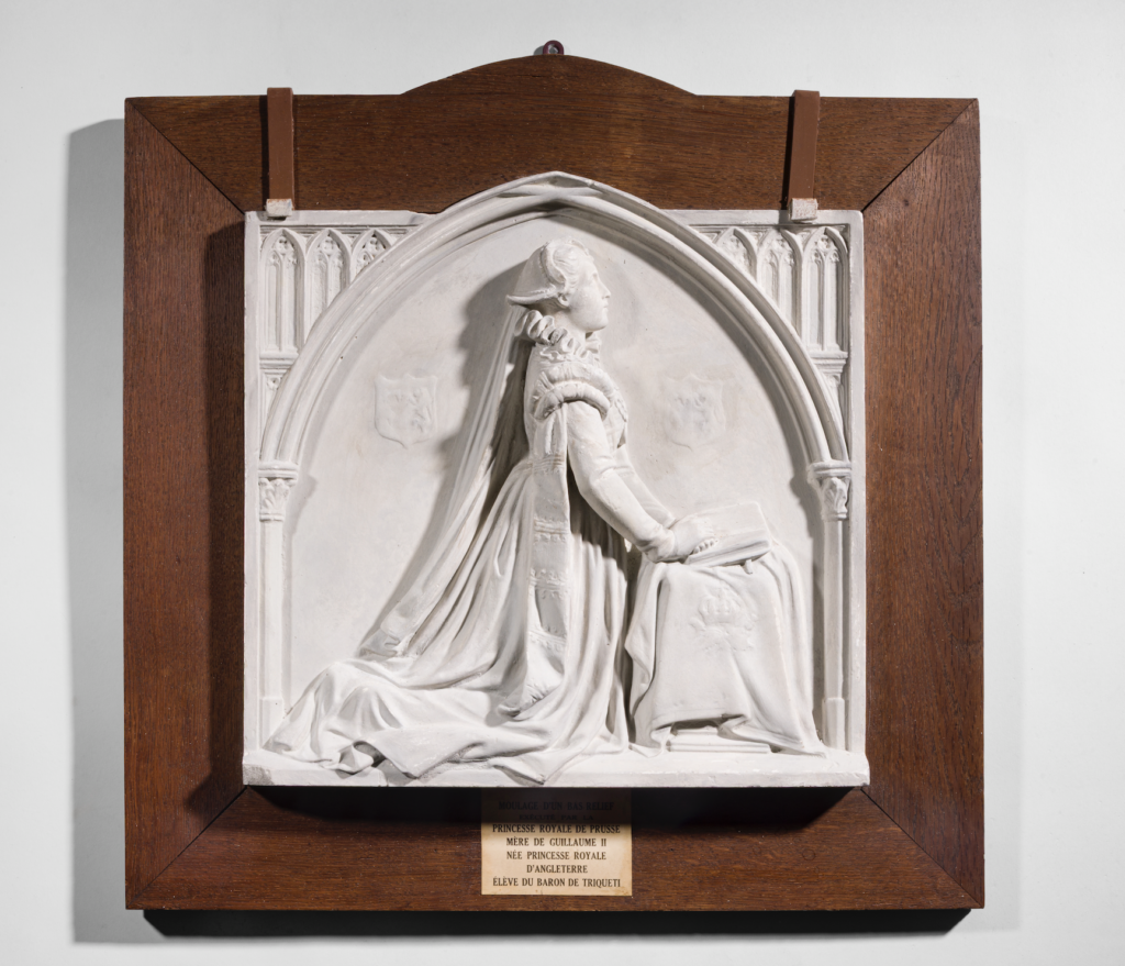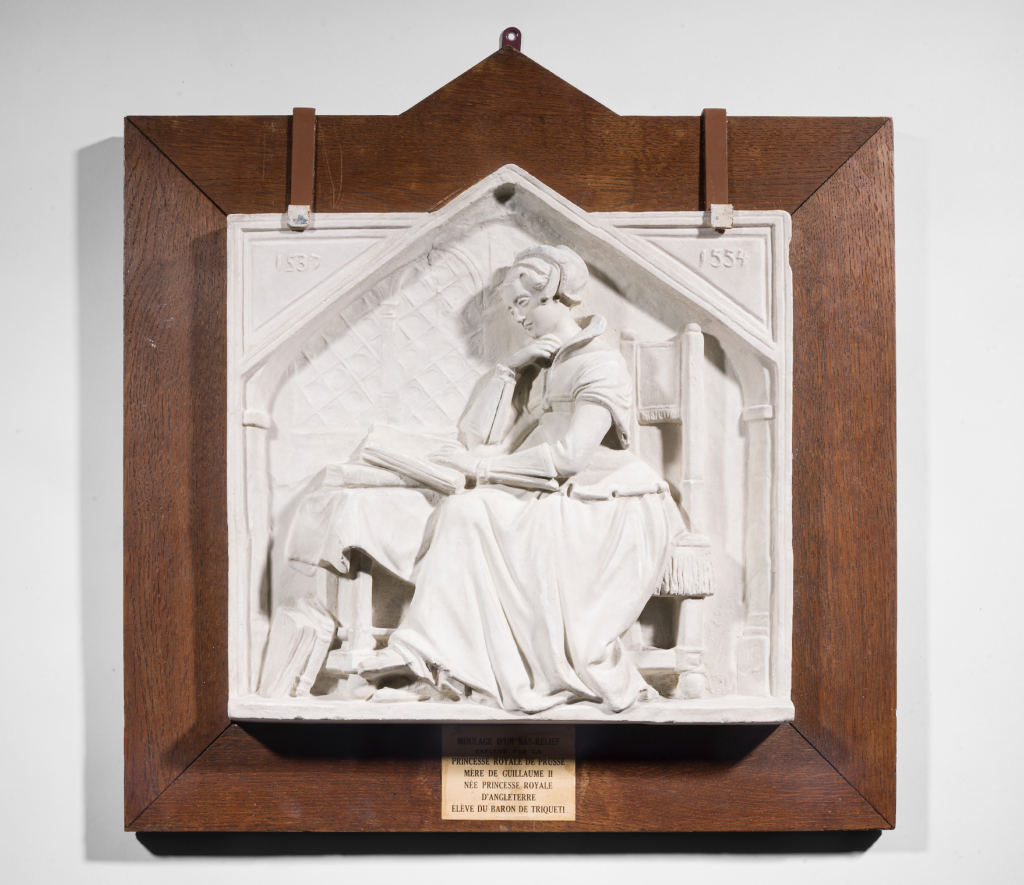 Portent un cartel à l’avant : « Moulage d’un Bas-relief/exécuté par la/ princesse royale de Prusse/ mère de Guillaume II/ née princesse royale/ d’Angleterre/ Elève du baron de Triqueti » et une étiquette avec l’inscription manuscrite au revers « Fait et offert au baron Henry de Triqueti / Par la Princesse royale de Prusse/ Princesse royale d’Angleterre »