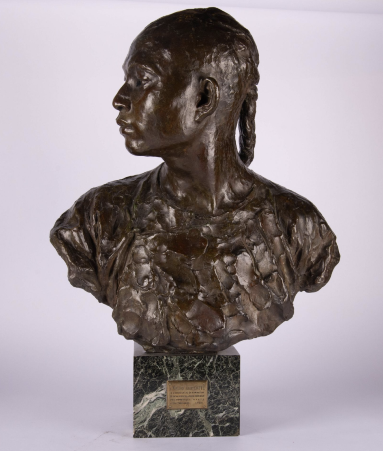 Le modèle de ce buste correspond à l’étude préparatoire de la figure de l’Asie réalisée par Jean-Baptiste Carpeaux en 1868 à l’occasion de la commande faite par la ville de Paris à l’architecte Gabriel Davioud d’une fontaine pour l’avenue de L’Observatoire. Pour ce projet, le sculpteur conçoit un groupe de quatre figures allégoriques supportant un globe évidé incarnant Les Quatre Parties du Monde soutenant la sphère céleste. Deux de ces allégories, l’Asie et l’Afrique, sont exécutées d’après nature. Plus tard, le buste du Chinois personnifiant l’Asie a été adapté en figure féminine afin d’harmoniser et équilibrer le groupe. Après la guerre de 1870 et l’exil de Jean-Baptiste Carpeaux en Angleterre, l’atelier d’Auteuil rouvre ses portes et engage la commercialisation du buste du Chinois. Ici, le sculpteur de Valenciennes est particulièrement innovant puisqu’il édite une version esquissée de cette œuvre, ce qui, pour l’époque, relève d’une audacieuse modernité. Le public apprécie la vitalité du modèle, les aplats de matière qui animent son costume et le mouvement du visage tourné vers la droite qui multiplie ainsi les points de vue. L’édition du vivant de Carpeaux est particulièrement rare, notre belle épreuve fait partie du corpus édité par la maison Susse de manière posthume entre 1920 et 1939.