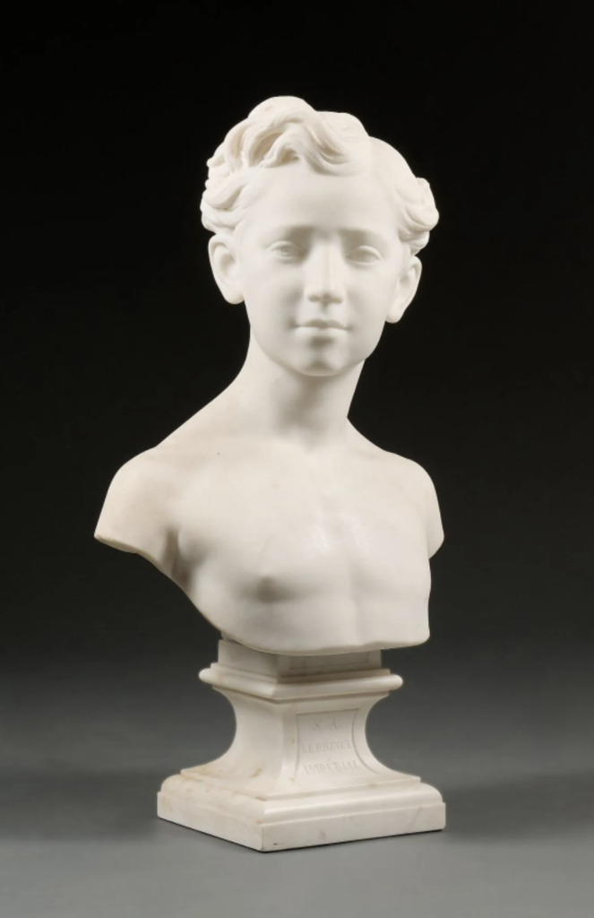 -Jean-Baptiste Carpeaux, Buste du Prince impérial, vers 1867, marbre, signé “JBte CARPEAUX TUILERIES PAQUES 1865”, inscrit “S.A. LE PRINCE IMPERIAL” sur le piédouche, H. 63,5 x L. 34 x P. 20 cm, Paris, Petit Palais.