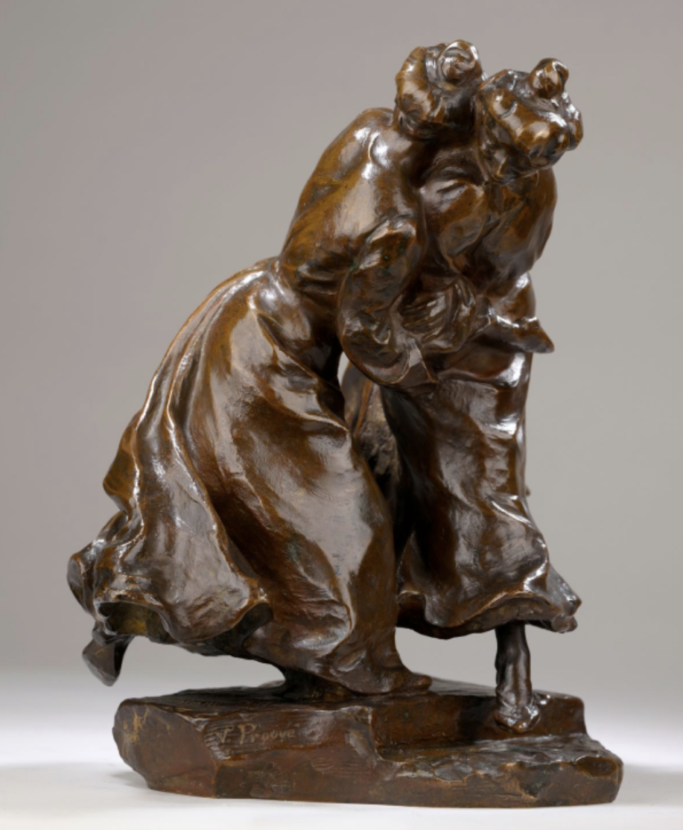 Le modèle de ce groupe figurant deux jeunes femmes espiègles saisies dans un instant de moquerie complice est réalisé en 1902, année durant laquelle Victor Prouvé quitte Paris pour Nancy, sa ville natale. Surtout célèbre comme peintre et proche collaborateur du verrier Émile Gallé, Victor Prouvé est également sculpteur. Abordant principalement le thème de la femme dans des attitudes sinueuses et expressives, son œuvre se rattache à l’esthétique de l’Art nouveau. Le modèle des Moqueuses est également édité en biscuit par les frères nancéens Joseph et Pierre Mougin.