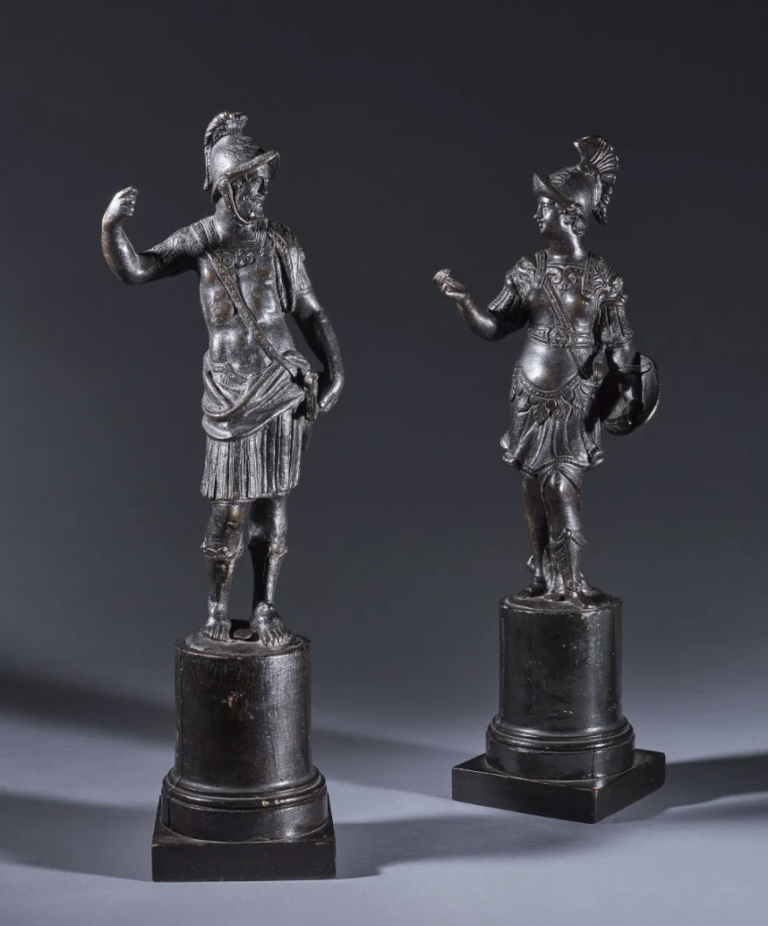 Lance dans la main droite de Mars manquante, main droite de Minerve restaurée au poignet, quelques usures à la patine.