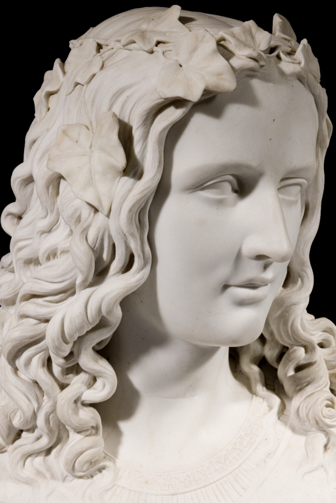 Il est plutôt tentant de voir dans cette tête couronnée de lierre, les douces boucles de cheveux lâches entourant le visage lisse et calme au regard concentré, la représentation d’une muse ou d’une allégorie de la poésie, proche d’ailleurs des figures angéliques de l’artiste. Cette représentation nous renvoie effectivement à la très belle figure assise écoutant un chœur d’anges dessiné par Triqueti sur le frontispice du manuscrit de chansons acheté par l’artiste pour le duc d’Aumale en 1861 (musée de Chantilly, n°inv. DE1208). Ce buste rappelle aussi les figures de muses médiévales, inspiratrices de Dante et de Pétrarque, à l’instar de Laure, Béatrice ou Vittoria Colonna que Triqueti représente à plusieurs reprises, notamment dans son spectaculaire vase, le Monument à Dante et à Pétrarque (musée du Louvre n°inv. RFML.SC.2024.22.1) ou encore le personnage central de l’Esquisse pour le vase commandé par M. Thiers, ministre de l’intérieur (ENSBA, n°inv. n°inv.17429-11).
