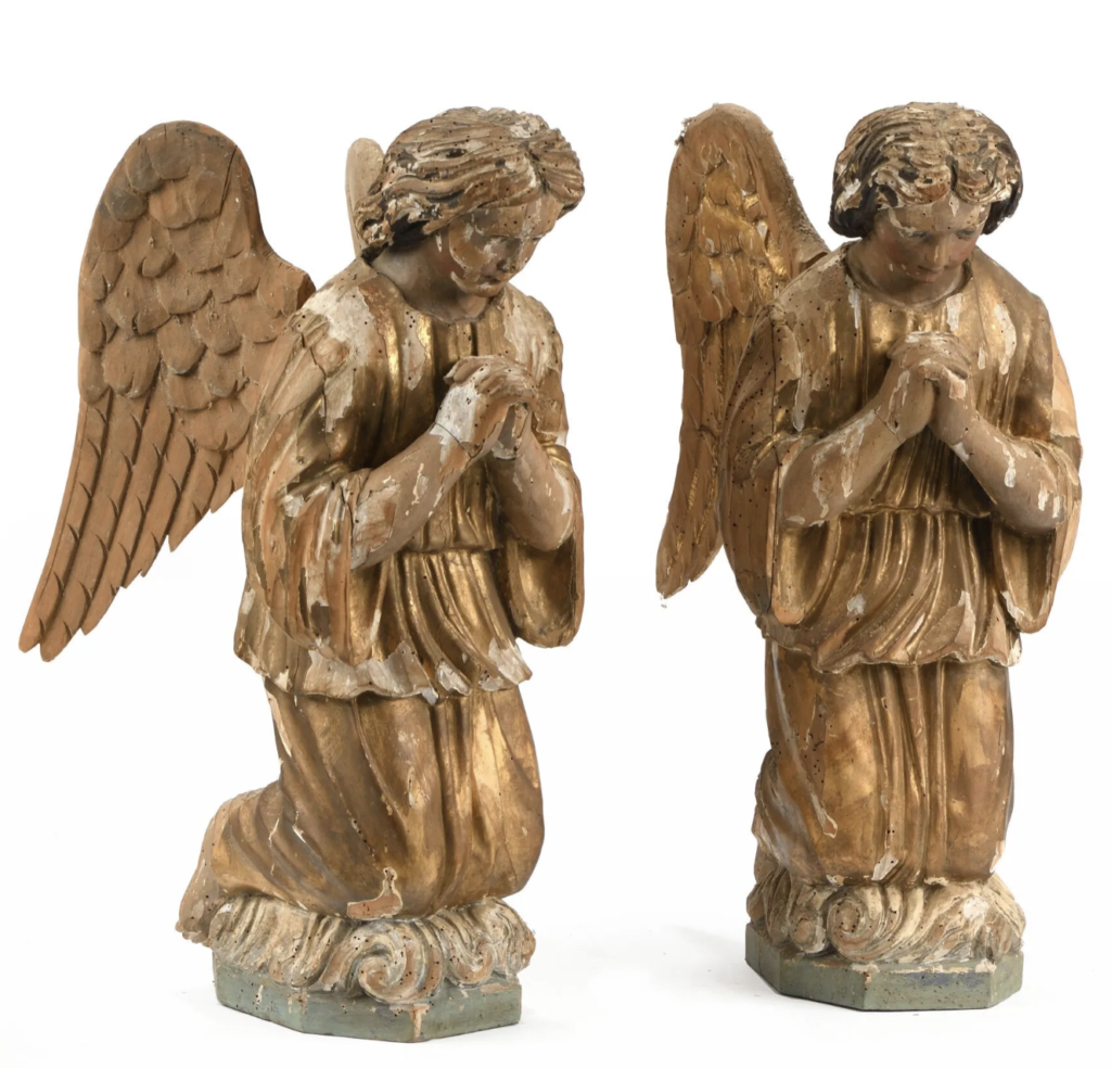 Fort empoussièrement, accidents, manques, polychromie et dorure lacunaires, ailes à part, restaurations