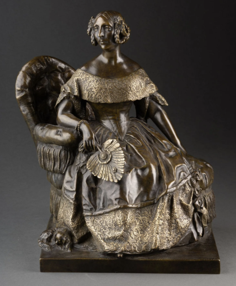 Paul Gayrard se forme auprès de François Rude et de David d’Angers. Spécialisé dans le portrait sculpté et les sujets animaliers, il expose régulièrement au Salon de 1827 à 1855. Il était le sculpteur de la famille d’Orléans, on connaît son portrait de Louis Philippe Ier (en 1831), du comte d’Orsay et du prince de Joinville. Celui de Louise d’Orléans représente une reine résolument moderne ; plutôt que sur un trône, elle pose sur une méridienne à capitons, avec pour attributs son éventail de plumes et son petit chien King Charles à ses pieds.