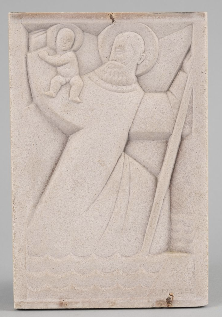 – Jan et Joël Martel, Saint Christophe, bas-relief en plâtre, signé « J. MARTEL » en bas à droite, Croix, Villa Cavrois.