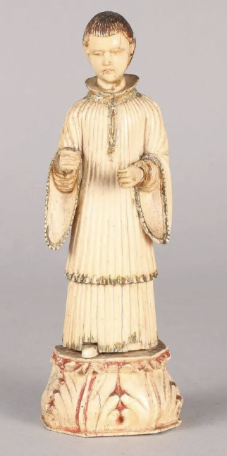 Statuette en ivoire sculpté, doré et polychromé sur une base en ivoire polychromé à décor de feuilles d'acanthe