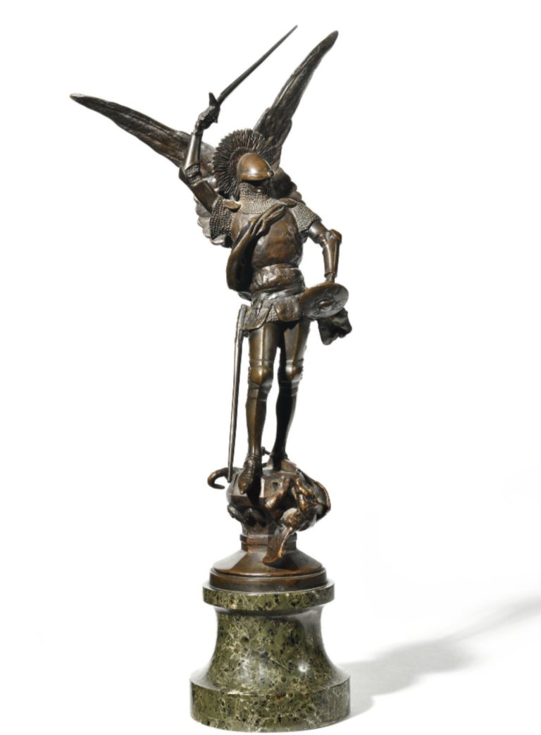 -Emmanuel Frémiet, Saint Michel, vers 1897, groupe relié en cuivre, porte une inscription sur une plaquette placée sur le socle « Exécuté par la Société Ph. Monduit », H. 617 x L. 260 x P. 120 cm, Paris, musée d’Orsay, inv. DO 1983 80.