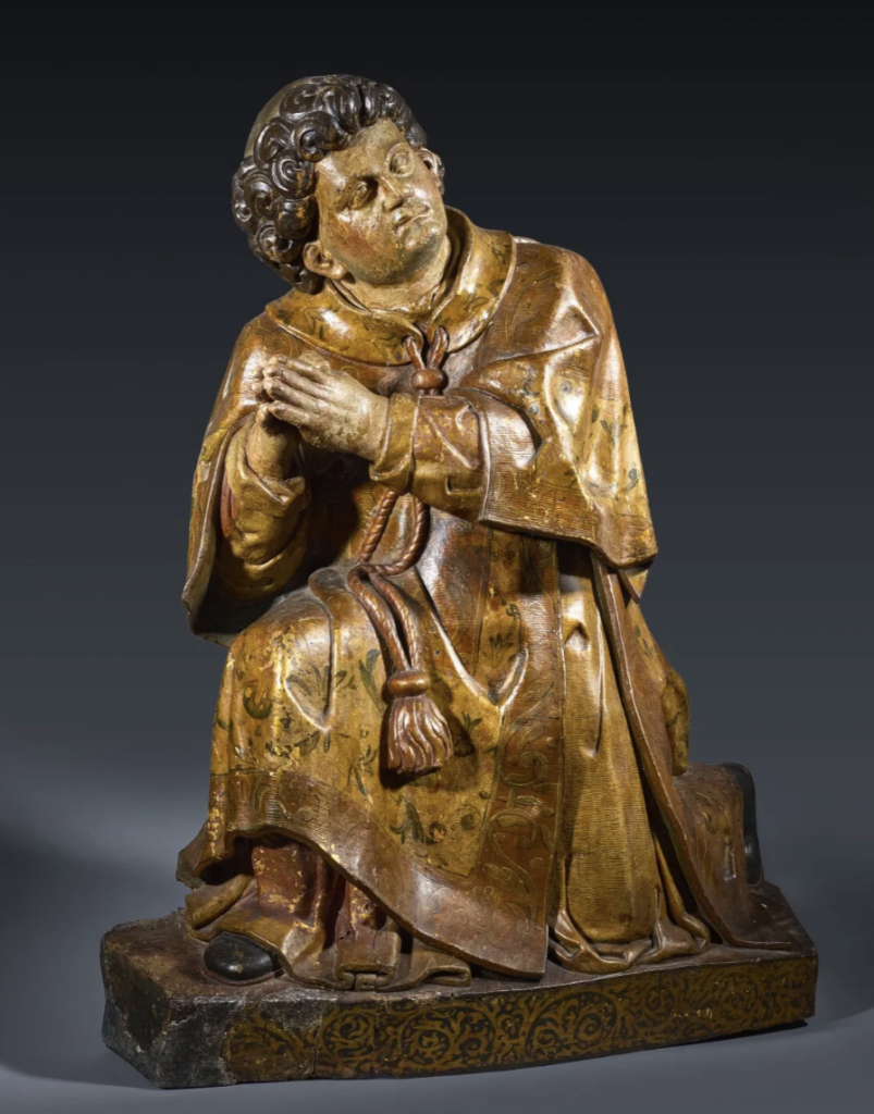 Reprise de la polychromie sur le visage et la chevelure, polychromie d'origine visible sous un dégagement partiel.