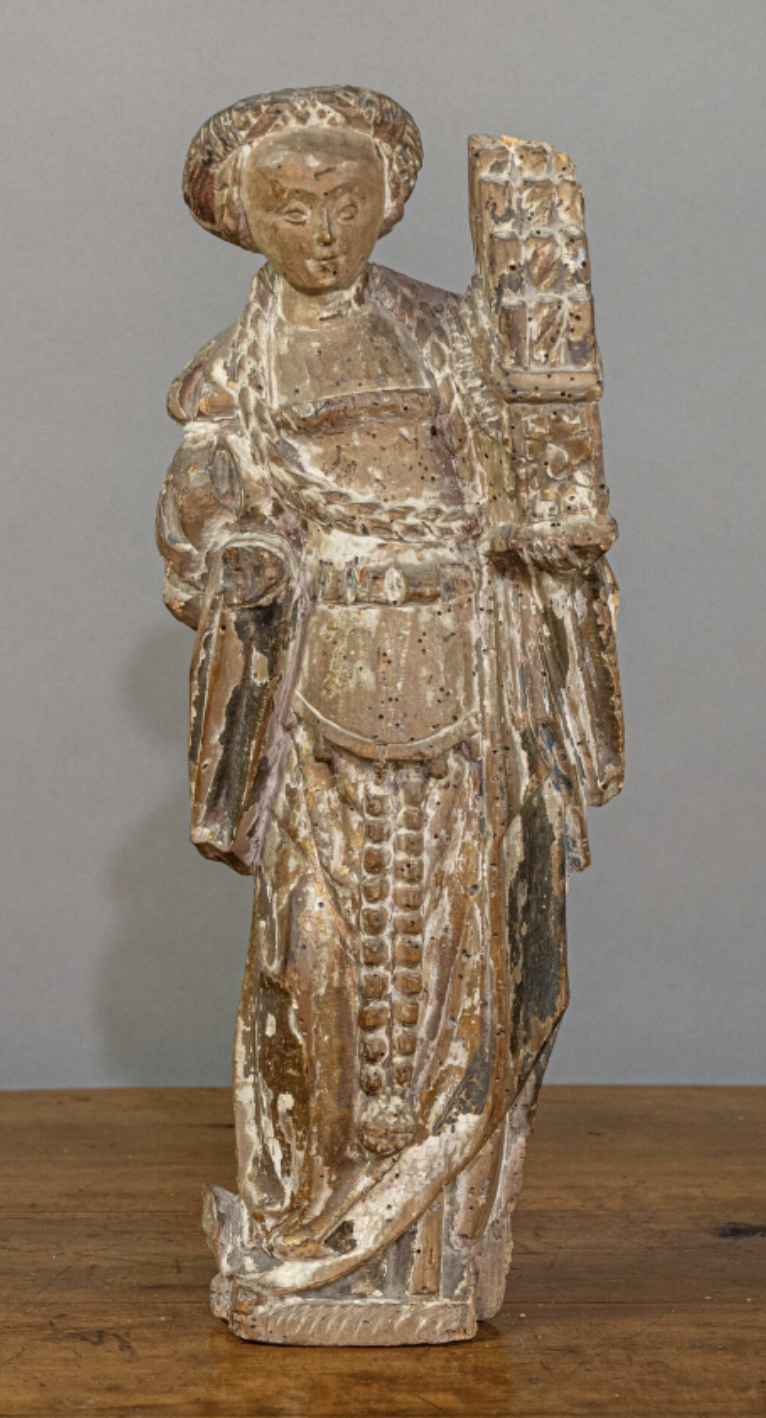Statuette en bois sculptée en applique avec traces de polychromie et de dorure