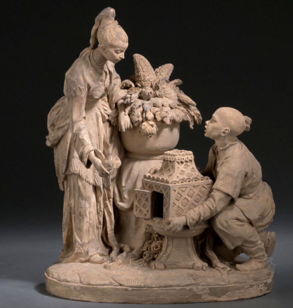 Réalisée vers 1750 et 1760, alors que Friedrich Elias Meyer travaille pour la manufacture de porcelaine de Meissen depuis 1748, cette composition est certainement un modèle pour une statuette en porcelaine. Les détails pittoresques des costumes ainsi que la symbolique suggestive de la cage et de l’oiseau sont caractéristiques de la tendance syncrétique des arts décoratifs du XVIIIe siècle : au goût européen pour les scènes galantes à l’érotisme feutré se mêle un exotisme fantasmé.