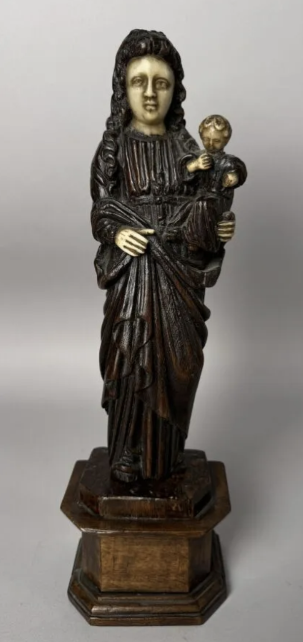 Petits accidents, notamment à la main droite de la vierge et manques, notamment la main gauche de l'enfant Jésus; trous en dessous et à l'arrière de la vierge