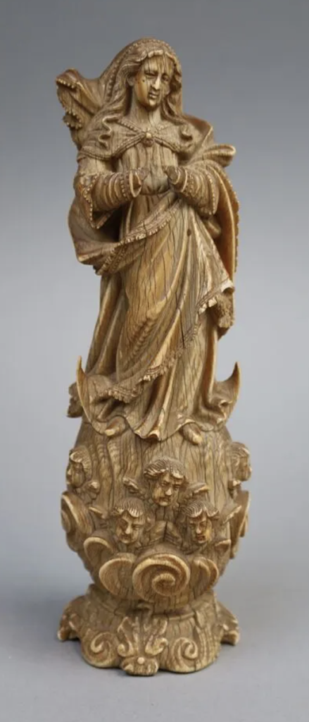 Cette statuette figurant une Vierge de l’Immaculée Conception est un témoignage de la production de statuettes religieuses en ivoire de la région dite « India Portuguesa », soit les colonies portugaises en Inde et probablement de la colonie de Goa, grand port commercial. Ces ivoires sont de nouveaux produits de luxe en Europe, produits afin de satisfaire à la fois la demande des colons sur le territoire et la demande d’exportation répondaient au besoin des dogmes, ici , celui de la conception sans péché de la Vierge réaffirmé précédemment par le concile de Trente dans le cadre de la Réforme catholique, triomphe durablement en Espagne dans le premier quart du XVIIème siècle, grâce à l’implication de la monarchie espagnole qui voit l’adhésion à la dévotion de la ‘Vierge sans tâche’ comme un moyen de resserrer autour du roi et de la religion les Espagnols contre leurs ennemis. L’œuvre taillée avec beaucoup de délicatesse et de soin présente une influence du courant baroque sevillan avec les détails du voile flottant derrière la tête et des mouvements du manteau remontant en tablier sur le devant de la robe qui permettent de la dater du XVIIIème siècle.