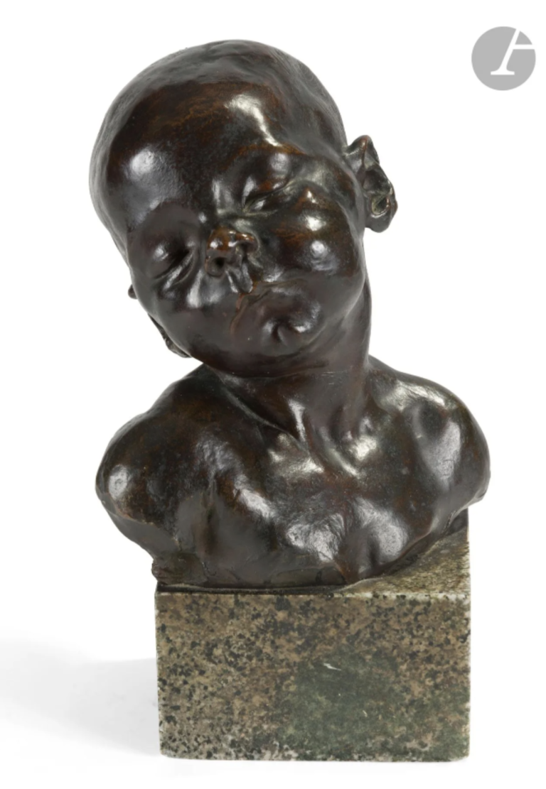 La maternité et l’enfance sont des thèmes chers à Aimé-Jules Dalou lors de son exil en Angleterre. Le Buste de bébé endormi est à l’origine une étude pour le groupe Parisienne allaitant (Paris, Petit Palais, inv. PPS298) dont le marbre est exposé au Salon de la Royal Academy de Londres en 1872. On le retrouve dans d’autres compositions du sculpteur notamment dans la Berceuse et le Monument aux petits-enfants de la Reine Victoria. Le modèle de ce charmant buste est édité en marbre du vivant de l’artiste et en bronze par le fondeur Hébrard selon un contrat établi par les héritiers en 1902.