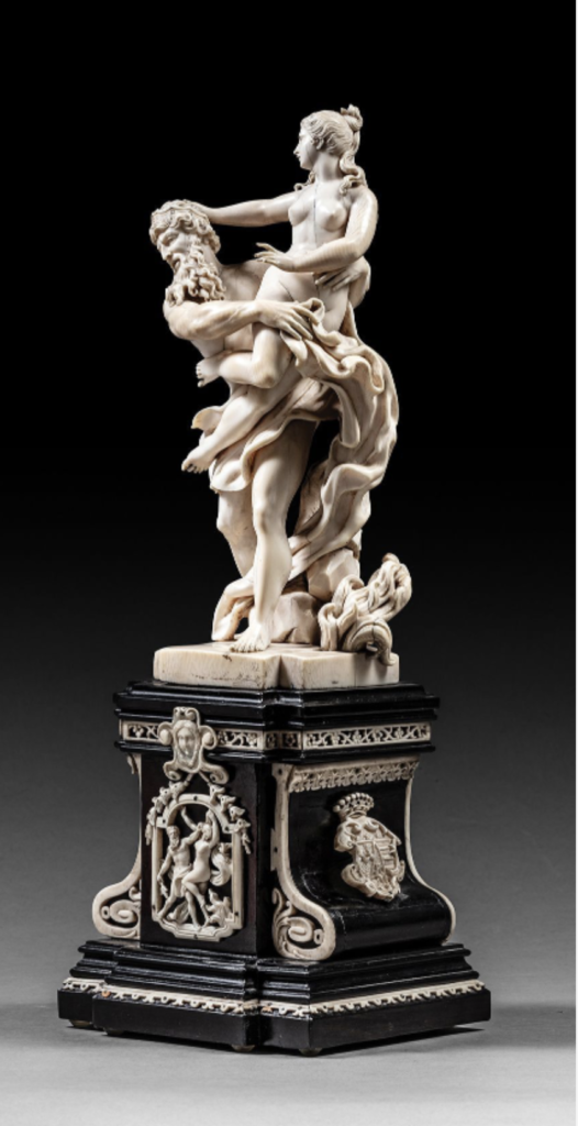 L’œuvre s’inscrit dans le contexte de revival stylistique et de collectionnisme qui ont poussé de nombreux ateliers spécialisés dans l’ivoire, comme à Dresde, Berlin et Vienne, à produire pour des collectionneurs aisés et éclairés des petits groupes inspirés de grands modèles baroques. Les artistes du XIXème siècle s’efforcent de rivaliser avec la virtuosité technique de leurs prédécesseurs tout en adaptant parfois leurs compositions luxueuses et abouties à la sensibilité de cette période. Dans la même idée, le musée du Louvre conserve une ravissante Coupe aux divinités en ivoire, réduction, elle aussi, d’une œuvre monumentale, la Fontaine de Flore érigée à Palerme en 1698 par le sculpteur Paolo Amato (1634-1714). Considérée par le grand spécialiste des ivoires baroque Christian Theuerkauff comme une œuvre du XIXème siècle, elle est prudemment présentée avec une interrogation comme « Allemagne ou Autriche du premier tiers du XVIIIème siècle ? (H. 29,5 cm) » par le musée parisien.