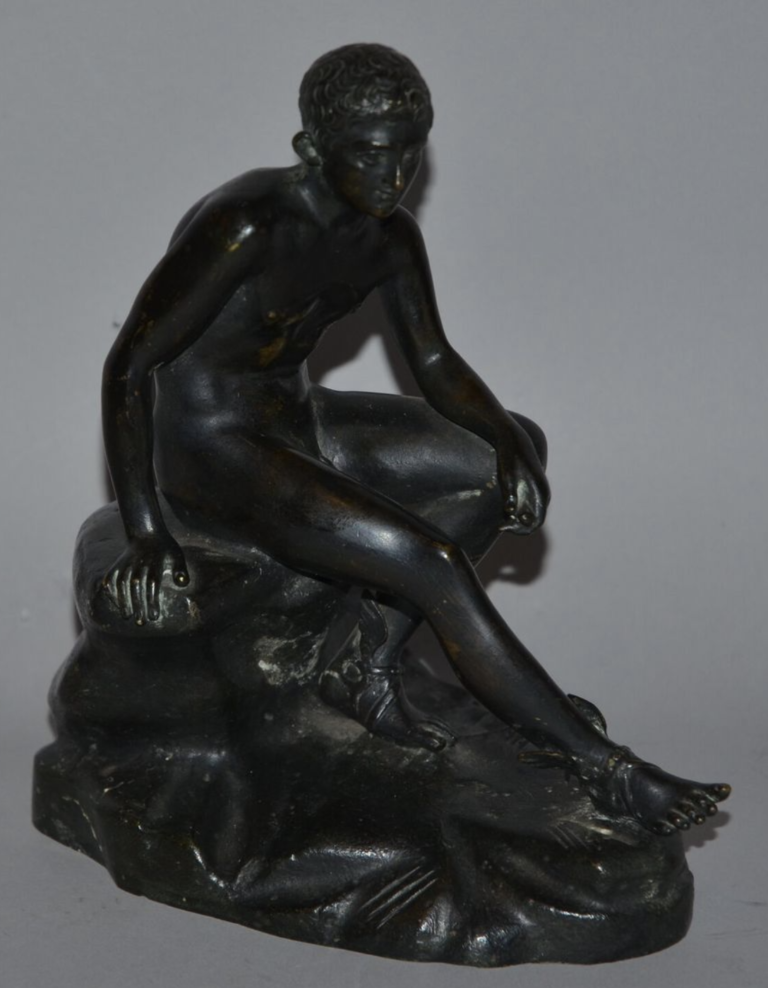 – Copie romaine d’un original grec de l’école de Lysippe (IVème siècle avant JC), Mercure assis, bronze, H. 105 cm, trouvé dans la Villa des Papyrus à Herculanum en 1758, musée archéologique national de Naples.